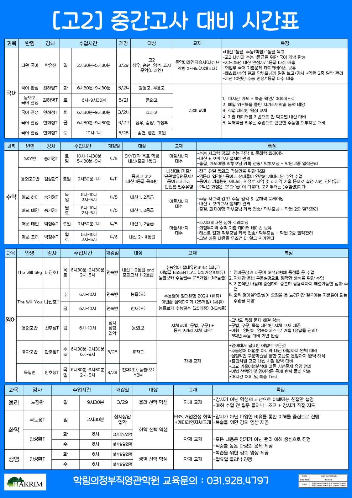 [공지] [고2] 1학기 중간고사 내신대비 시간표