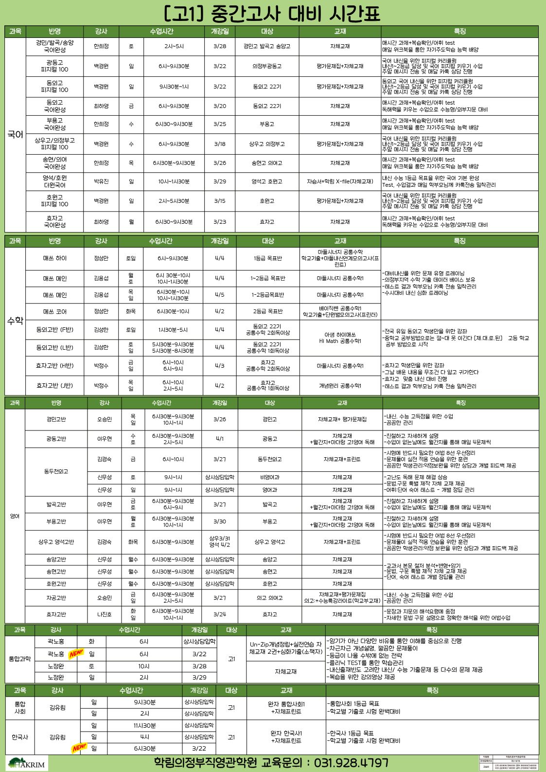 [공지] [고1] 1학기 중간고사 내신대비 시간표