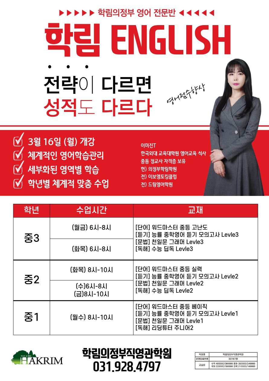[중등 영어] 3월 16일 개강 시간표 (중1~중3)